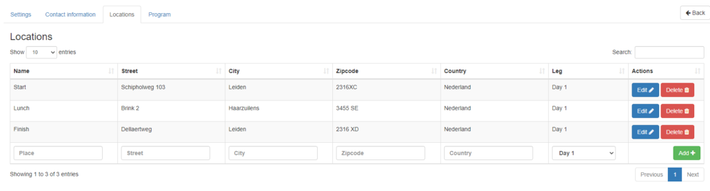 Locations can be assigned to a Leg. This way you can enter the locations of the Start, Finish and other locations that may be necessary for Participants to have on hand.
