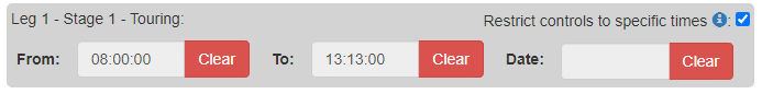 The base time you set will also set the starting time for the Leg / Stage / Class combination on the “Legs & Stages” tab of the “Edit Rally” page. Likewise, when editing this field on the Legs & Stages Tab, this will change the Base starting date & time. However, new starting times will only be calculated when clicking on “Generate starting list” button on the “Starting list” page.